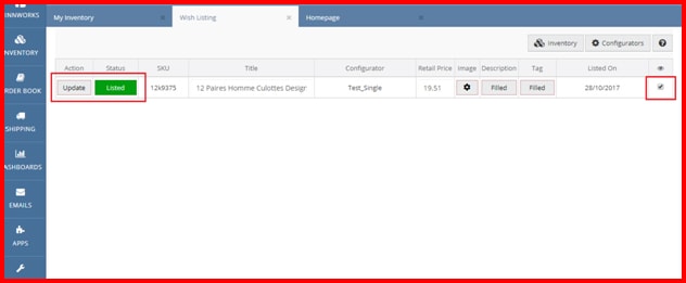 As with single listings, once the listing is created, status will be changed to Listed. When the button shows Update and checkbox is checked, it means the product is enabled in the Wish channel.