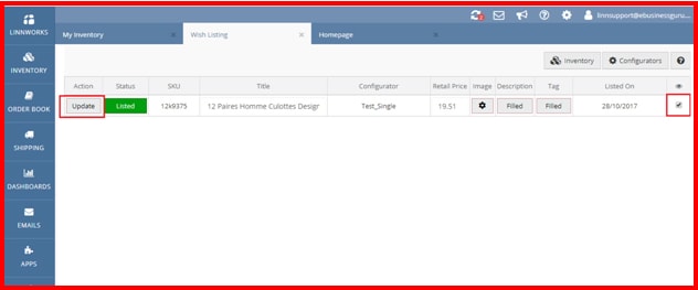 To update title, price, description, category, images and tags on Wish for the listings already created, click on the Edit Listing option on the main inventory screen. This will redirect accordingly, depending on if it’s a single or variation listing. You can update the details of that product by clicking on update button. This functionality is same for single product listings and variation product listings.